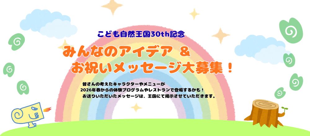 2026年度春~の体験プログラムやレストラン「もりもり亭」で皆さんのアイデアが形になるかも⁉ 添付の応募用紙に記入後、こども自然王国までメー…