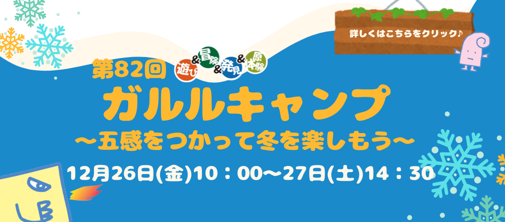 12月26日(金)~12月27日(土)は、冬のガルルキャンプを開催いたします。 今回のテーマは「五感を使って冬を楽しもう」です。 雪遊びや夕…
