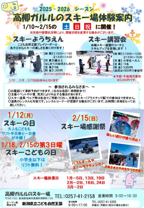 2026年01月07日 ガルルのスキー場 お知らせ ガルルのスキー場の体験案内 1月10日(土)よりスキー場で開催される体験プログラムの案内ができましたので、ぜひご覧ください。 雪国キッズのスキーデビューはガルルできまり!小学生以上はコーチからの本格レッスンでレベルアップしよう! R7スキー場体験案内ダウンロード